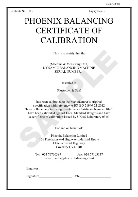The calibration of measuring equipment is intrinsic to its accuracy and performance. Using UKAS traceable weights, Phoenix Balancing Ltd provides a machine calibration service to calibrate your machine using the guidance provided by BS ISO 21940-21:2012 and the manufacturer’s original instructions.